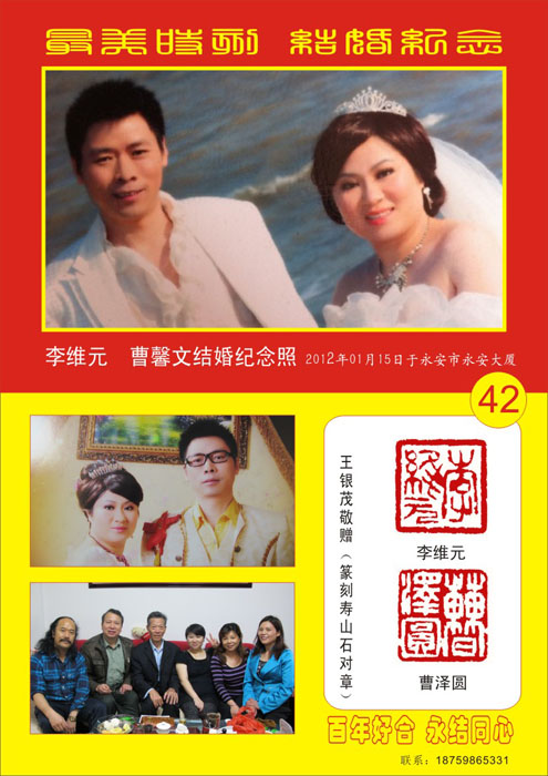李维元 曹泽圆(曹馨文)结婚纪念照 2012年01月15日于三明永安市永安大厦 (本印谱十年后结集出版)