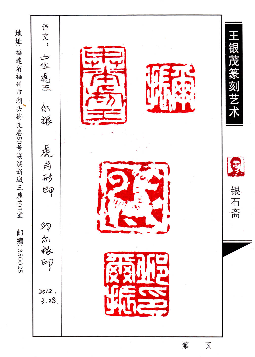 中华虎王 尔振 虎肖形印 邱尔振印 2012.3.28王银茂刻于福州