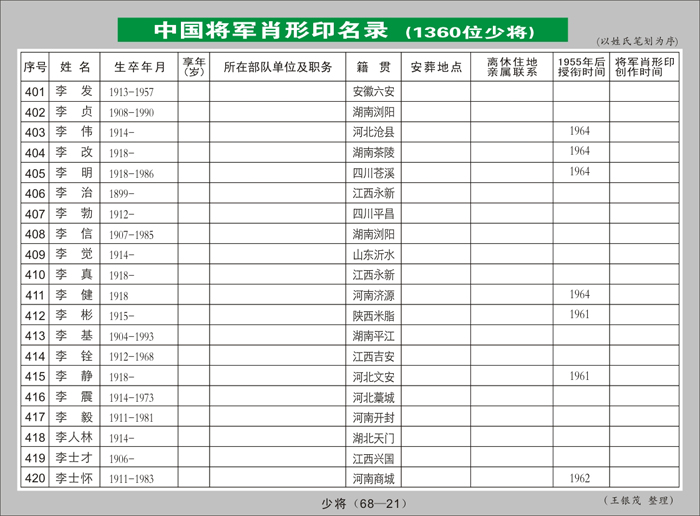 开国少将肖形印名录之五(401—500)【 21页—25页 共68页】