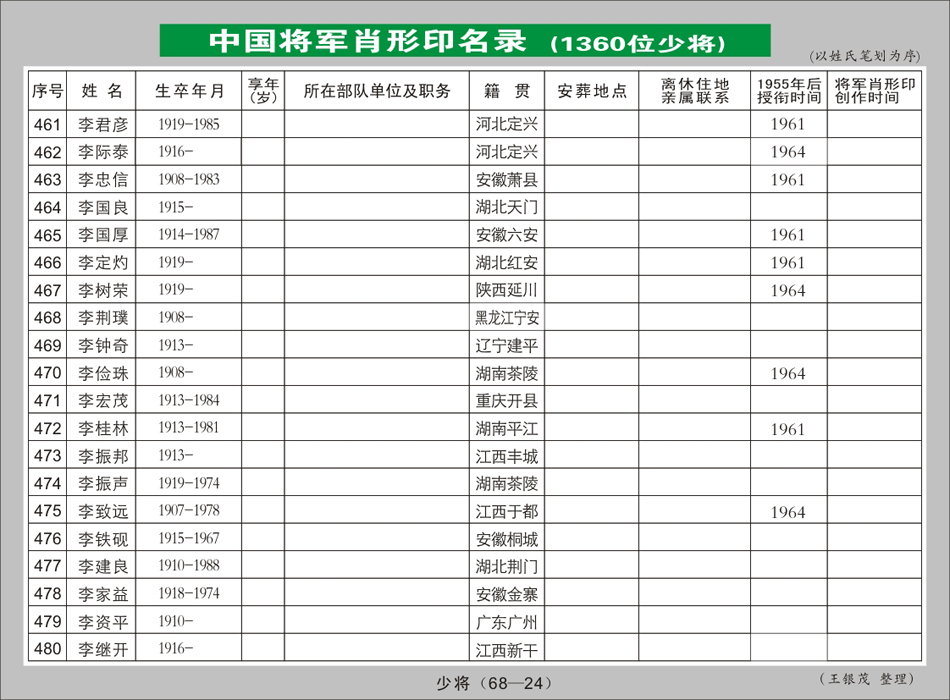 464.李国良(1908一1983.06.23)湖北天门,江西省军区副司令员