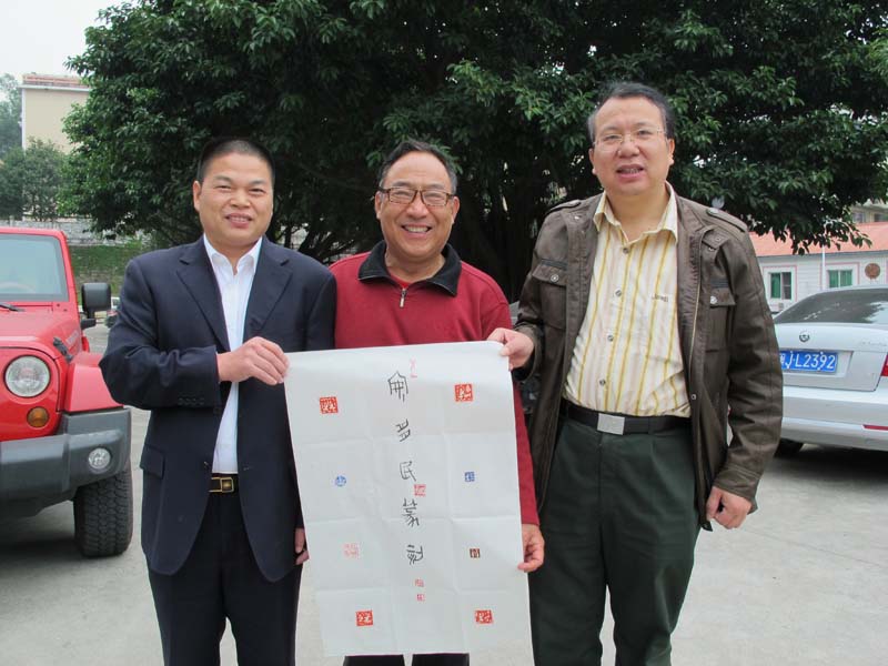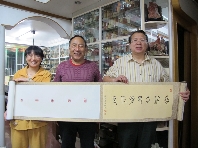2012年11月13日,中国书协会员、西泠印社社员安多民先生(中)为王银茂夫妇制作《安多民肖形印》五米长卷并留影