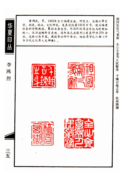 《华夏印丛》第35页 篆刻作者:李鸿烈(李鸿烈,男,1932年生于福建安溪。研究生。长期从事哲学、经济、政治、文化研究,发表国论著150多万字,现为福建社会科学院教授。篆刻业余自学,作品风格追求传统与创新相统一,运刀流畅朴实自然。近年来已在报刊上发表印作270余方,还热心为专家、教授等治印千余方,他的名字已入编《中国当代文化名人大辞典》。)