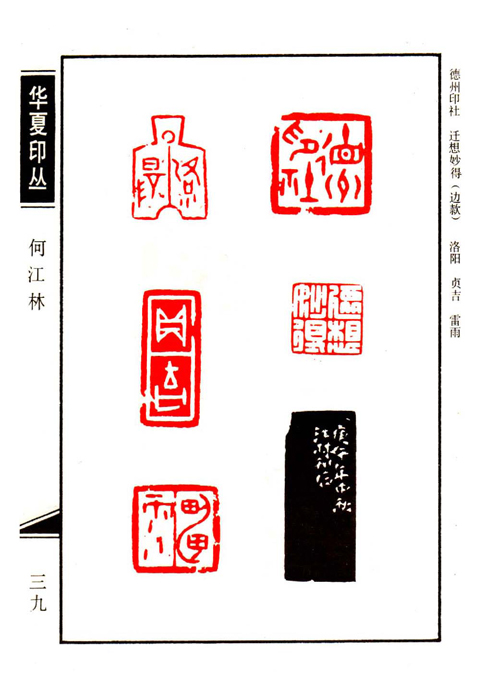 《华夏印丛》第39页 篆刻作者:何江林(何江林,号契石,1957年生,现就职于山东德州化工机械厂。作品多次参加省地市及全国性书展赛,曾获“书圣杯”国家书法大赛二等奖。友作品收入《全国印社篆刻联展作品集》、《当代青年篆刻一千家》等书中。县为国际书画协会会员、德州地区书法家协会会员、德州印社理事。)