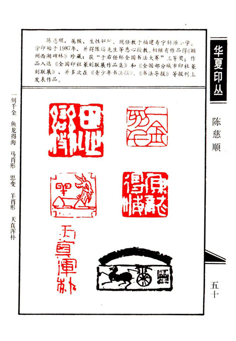 《华夏印丛》第50页 篆刻作者:陈慈顺(陈慈顺,属猴,生性好玩,现任教于福建寿宁斜滩小学。学印始于1987年,并得到陈远先生的悉心授教。相继有作品得《颍州西湖碑林》珍藏;获“于右任杯全国书法大赛”三等奖;作品入选《全国印社篆刻联展作品集》和《全国部分城市印社篆刻联展》,并多次在《青少年书法报》、《书法导报》等报刊上发表作品。)
