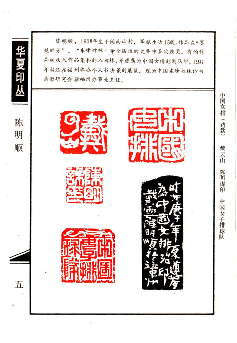 《华夏印丛》第51页 篆刻作者:陈明顺(陈明顺,1958年生于闽南山村,军旅生活15载。作品在“墨苑群芳”、“东峰碑林”等全国性的大赛中多次获奖,有的作品被收入作品集和刻入碑林,并遵嘱为中国女排刻制队印。1991年初还在福州举办个人书法篆刻展览。县为中国东峰碑林诗书画影研究会驻福州办事处主任。)