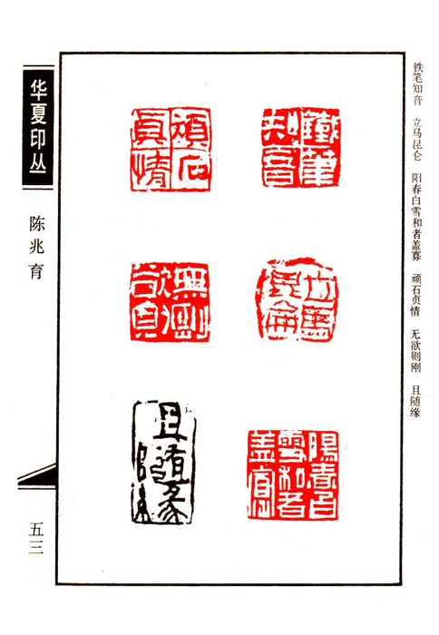 《华夏印丛》第53页 篆刻作者:陈兆育(陈兆育,1947年生于福州,号碧天。师从葛颐昌、周哲文先生,又得余纲、叶一苇、王镛、刘江诸老师指点,崇尚朴拙雅逸的印作风格,曾获全国性书赛篆刻等级奖九次,优秀奖多次。有作品入选《当代印人大系》、《炎黄子孙书画册》、《当代书法篆刻艺术大观》等书,印学论文曾在全国第三届书研会上交流和在专业刊物上发表。现为省书协会员、中国青少年书法协会会员、岐阳印社名誉理事、闽海印社社员、华夏印友会副秘书长。)