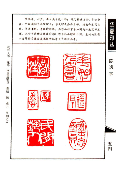 《华夏印丛》第54页 篆刻作者:陈逸亭(陈逸亭,46岁,舞台美术设计师;现为福建美协、书协会员;中国潇湘书画院院士;胡主席印友会会员等。擅长山水花鸟画、书法状况,并能诗能琴,其作品经常参加国内外展览并发表,不少书画作品被政府部门作为礼品赠送外宾,泉州地区数以百计的名胜古迹匾额碑记等大半均出于其手。)