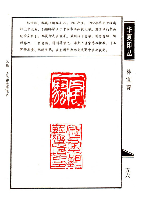 《华夏印丛》第56页 篆刻作者:林宜琛(林宜琛,福建省闽侯县人。1940年生,1965年毕业于福建师大中文系,1988年毕业于中国书画函授大学。现为华韵书画联谊会会长,华夏印友会理事。篆刻始于自学,刻苦自励,频频奏刀,一任自然,得到周哲文、潘主兰诸家悉心指教。作品浑穆厚重、淋漓险绝,在全国举办的大赛中多次获奖。)