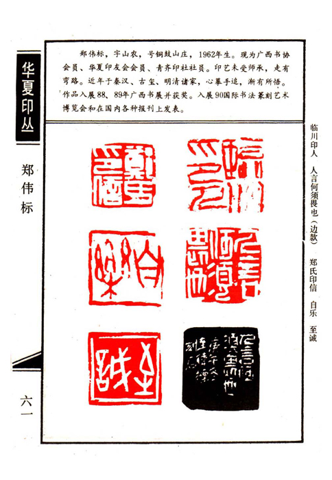 《华夏印丛》第61页 篆刻作者:郑伟标(郑伟标,字山农,号铜鼓山庄,1962年生。县为广西书协会员、华夏印友会会员、青齐印社社员。印艺未受师承,走有弯路。近年于秦汉、古玺、明清诸家,心摹手追,渐有所悟。作品入展88.89年广西书展并获奖。入展90国际书法篆刻艺术博览会和在国内各种报刊上发表。)