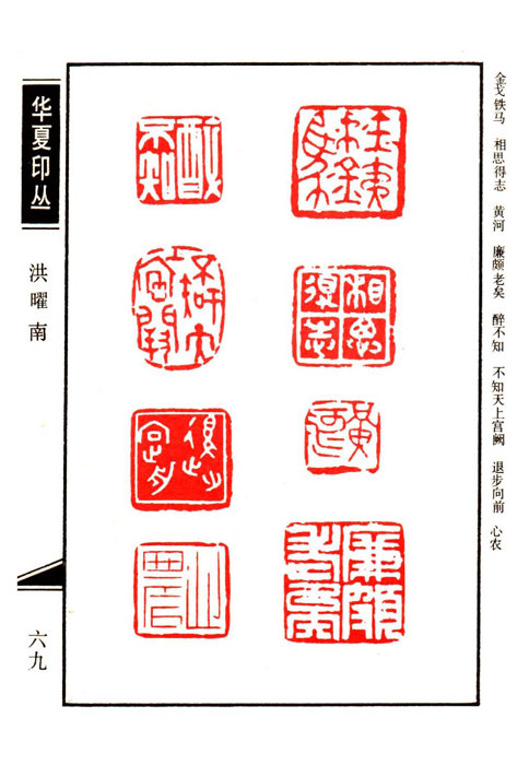 《华夏印丛》第69页 篆刻作者:洪曜南(洪曜南,1962年2月生。1980年始接触书法篆刻,从此即未曾稍离。曾任《印林》双月刊总编辑,现为政治大学临池社篆刻指导老师、他问篆刻学会会员兼活动组干事、玄心印会会员。书法师学王北岳、汪中、黄群英、社忠诰诸先生。篆刻师学王北岳、蔡雄祥、薛志扬诸先生。书法 一篆隶见长,篆刻风格多样,尚未有自家面貌。)