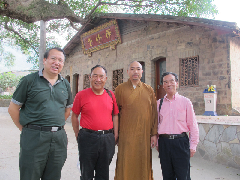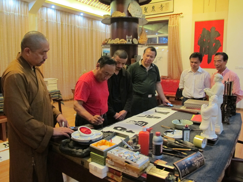 安先生与印社成员交流。古刹重兴逢盛世,慈航普渡涌甘泉。传奇故事榴花洞,缔结新生欢喜缘。(林芸生 撰诗二)