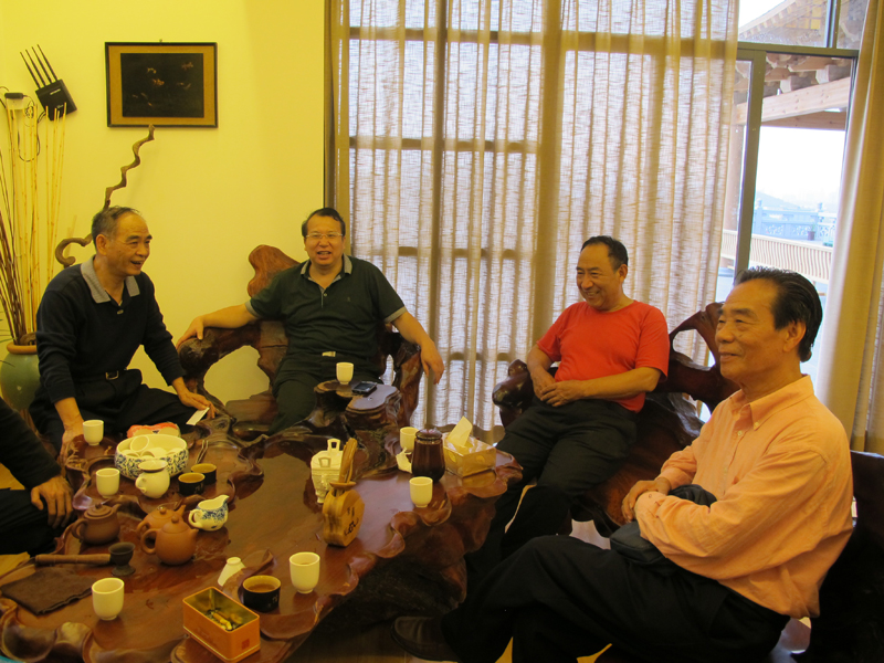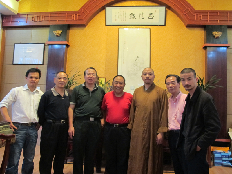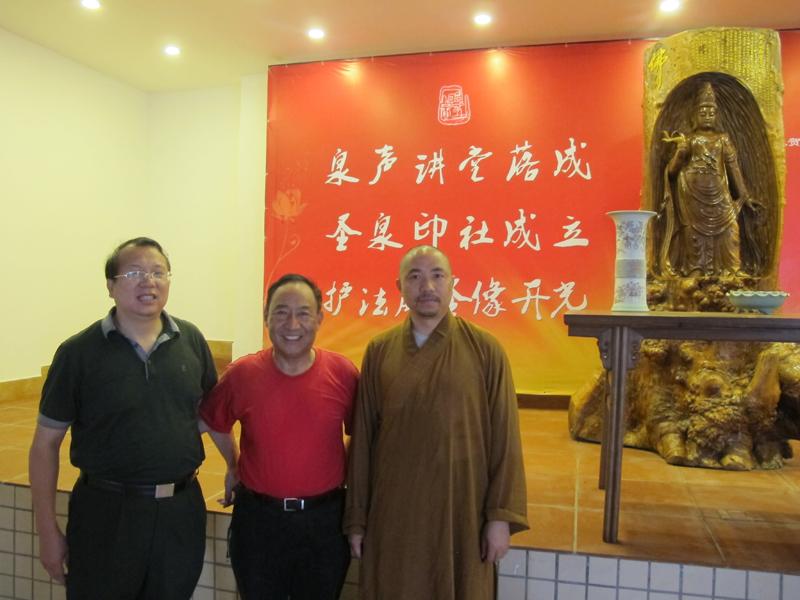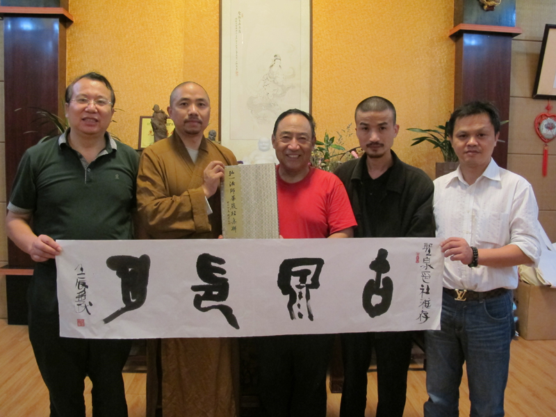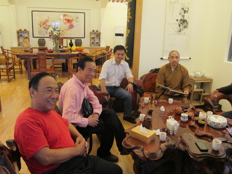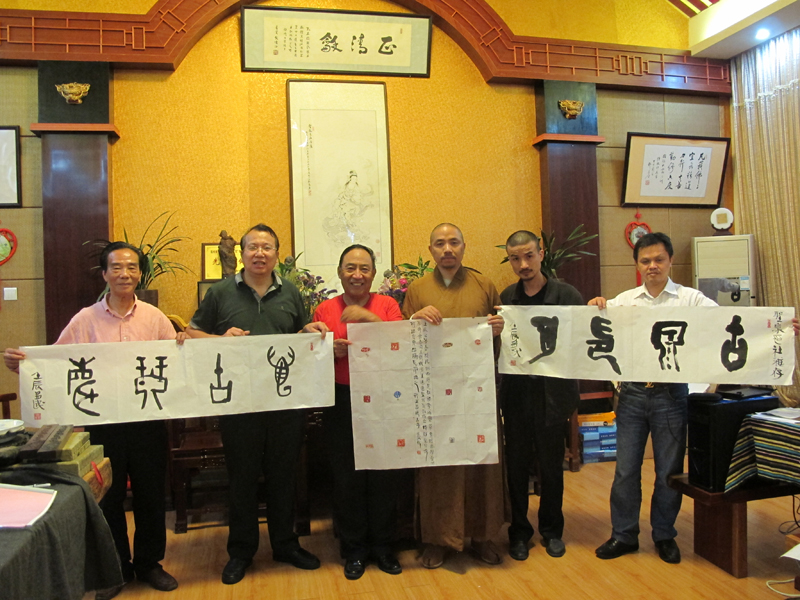 2012年11月10日,山西平遥书法篆刻家安多民参加杭州西泠印社会议后专程前来福州拜访王银茂,并到圣泉印社与印友们进行艺术交流。左起:王银茂、安多民、释传观、林芸生(国家一级编剧)