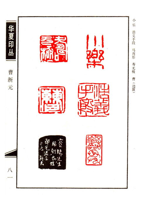 《华夏印丛》第81页 篆刻作者:曹新元(曹新元,1960年生,北京市人。幼年喜爱书画印,长年不辍,自强部不息。曾得康殷、韩天衡、黄惇、王镛等名家亲授,颇得印章之真谛。作品多次参加全国性书展并在一些大展中获奖。现为中国当代书画研究会会员、书协北京分会篆刻艺术研究会会员、淮海印社、华夏印友会理事。)