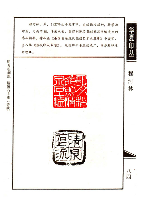 《华夏印丛》第84页 篆刻作者:程河林(程河林,男,1937年生于天津市。自幼操刀刻竹,转学治印后,刀而不辍,博采众长,曾得到著名篆刻家冯书楷先生的悉心指导。作品在《全国首届现代篆刻艺术大展赛》中获奖,并入编《当代印人名鉴》。县就职于重庆仪表厂,系华夏印友会理事。)