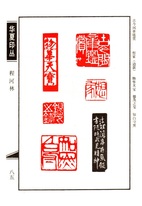 《华夏印丛》第85页 篆刻作者:程河林(程河林,男,1937年生于天津市。自幼操刀刻竹,转学治印后,刀而不辍,博采众长,曾得到著名篆刻家冯书楷先生的悉心指导。作品在《全国首届现代篆刻艺术大展赛》中获奖,并入编《当代印人名鉴》。县就职于重庆仪表厂,系华夏印友会理事。)