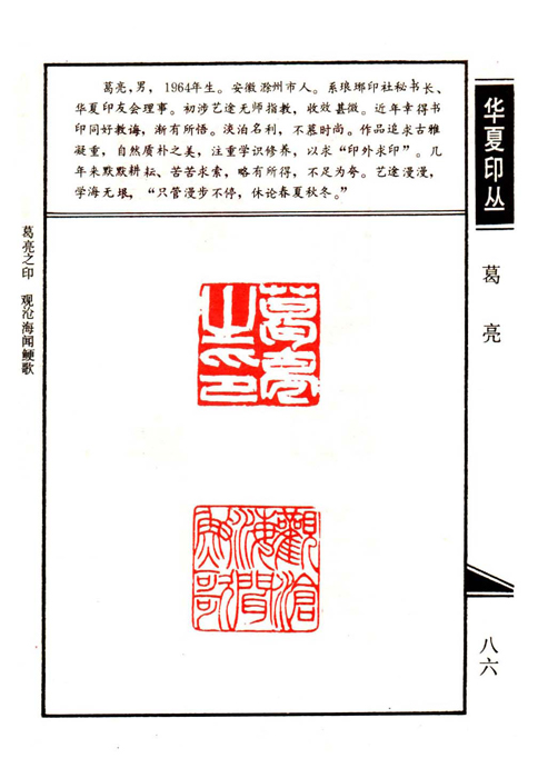《华夏印丛》第86页 篆刻作者:葛 亮(葛亮,男,1964年生。安徽滁州市人。系琅琊印社秘书长、华夏印友会理事。初涉艺途无师指教,收效甚微。近年幸得书印同好教诲,渐有所悟。淡泊名利不慕时尚。作品追求古雅凝重,自然质朴之美,注重学识修养,以求“印外求印”。几年来默默耕耘、苦苦求索,略有所得,不足为夸。艺途漫漫,学海无垠,“只管漫步不停,休论春夏秋冬。”)