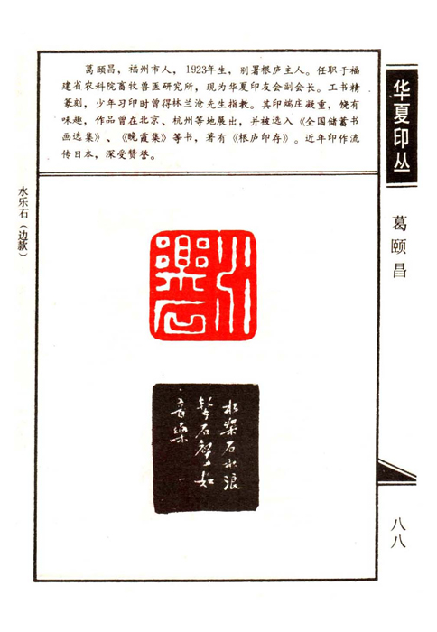 《华夏印丛》第88页 篆刻作者:葛颐昌(葛颐昌,福州市人,1923年生,别署根庐主人。任职于福建省农科院畜牧兽医研究所,现为华夏印友会副会长。工书精篆刻,少年习印时曾得林兰沧先生指教。其印端庄凝重,饶有味趣,作品曾在北京、杭州等地展出,并被选入《全国储蓄书画选集》、《晚霞集》等书,著有《根庐印存》。近年印作流传日本,深受赞誉。)