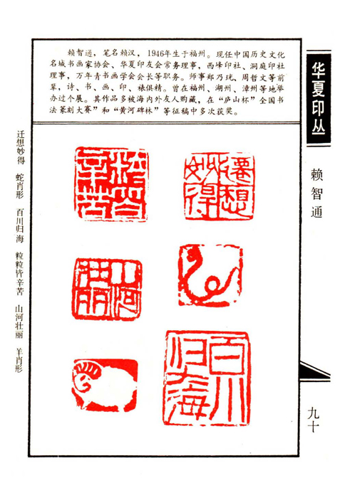 《华夏印丛》第90页 篆刻作者:赖智通(赖智通,笔名懒汉,1946年生于福州。现任中国历史文化名城书画家协会、华夏印友会常务理事,西峰印社、洞庭印社理事,万年青书画学会会长等职务。师事郑乃珖、周哲文等前辈,诗、书、画、印、裱俱精。曾在福州、湖州、漳州等地举办过个展。其作品多被海内外友人购藏,在“庐山杯”全国书法篆刻大赛和“黄河碑林”等征稿中多次获奖。)