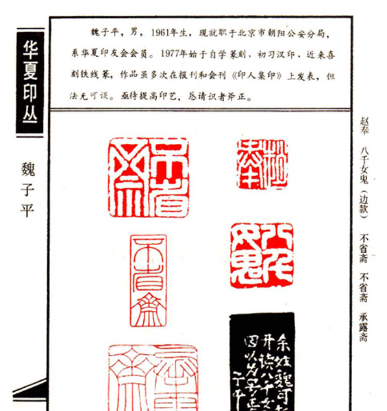 《华夏印丛》第95页 篆刻作者:魏子平(魏子平,男,1961年生,现就职于北京市朝阳公安分局,系华夏印友会会员。1977年始于自学篆刻,初学汉印,近来喜刻铁线篆,作品虽多次在包括和会刊《印人集印》上发表,但法无可谈。亟待提高印艺,恳请识者斧正。)