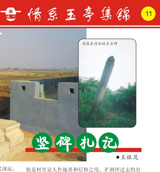 《竖碑扎记》:金秋八一,意义深远。而我,心情异常激动,久久不能平静。因为我终于实现了孩时的梦想。2005年吉日,亲手将墩上凉亭14根长柱和二块粗大的断石碑竖起来了。石碑重竖在村南,稳座在凉亭左侧,重振雄风,与村北兴龙庙左侧的斜石碑(上右图)交相辉映,更显神彩。
