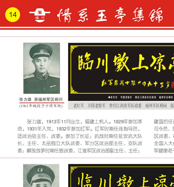 张力雄简介:张力雄,1913年11月出生,福建上杭人。1929年参加革命,1931年入党,1932年参加红军。红军时期任指导员,团政治处主任、政委。参加了长征;抗战时期任延安抗大队长、主任、太岳独立大队政委、军分区政治部主任、支队政委;解放战争时期任旅政委、江淮军区政治部副主任、主任;建国后任西南炮兵副政委、解放军13军政委、云南省军区副司令、昆明军区副参谋长、云南省军区第二政委、江西省军区政委、福州军区顾问。1961年晋升为少将军衔。是第五届全国人大代表,第六、七届全国政协委员。1999年被评为全国健康老干部。
