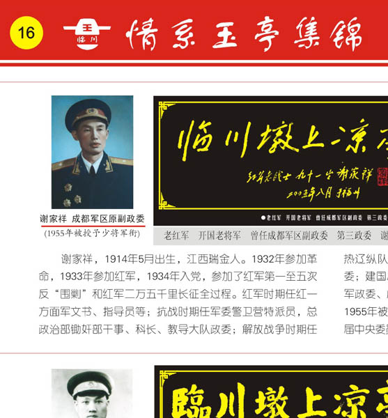 《凉亭外匾》谢家祥图片介绍:1.谢家祥成都军区原副政委(1955年被授予少将军衔) 2.老红军 开国老将军 曾任成都军区副政委 第三政委 谢家祥题 3.2003年7月1日,原福州军区顾问谢家祥将军(右三)与原福州军区老领导刘波、陈景三、王直、何云峰、颜红(自左至右)合影留念。