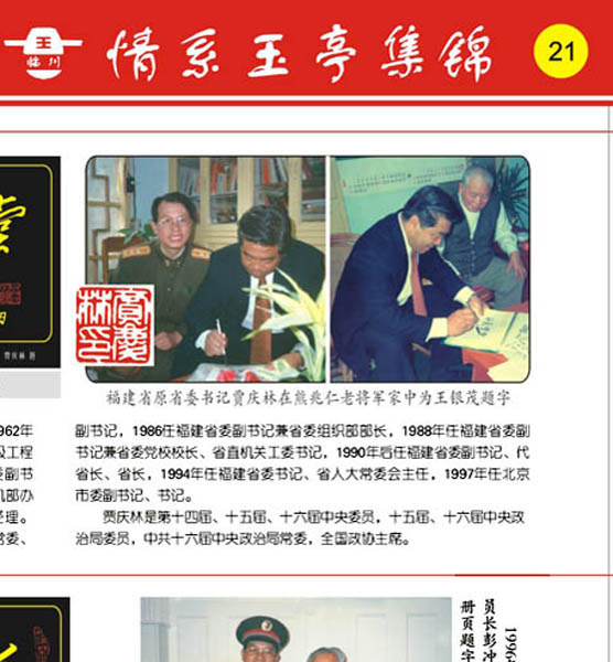 《凉亭外匾》贾庆林图片介绍:1.贾庆林 中央政治局常委 全国政协主席 2.正气堂堂 (贾庆林题) 3.福建省原省委书记贾庆林在熊兆仁老将军家中为王银茂题字