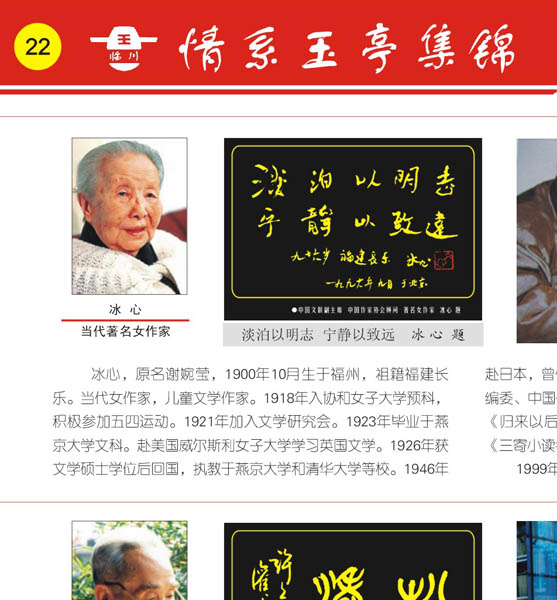 《凉亭外匾》冰 心图片介绍:1.冰心 当代著名女作家 2.淡泊以明志 宁静以致远 (冰心题) 3.著名女作家冰心与福建省统战部原副部长、立雪书院院长游嘉瑞亲切交谈。