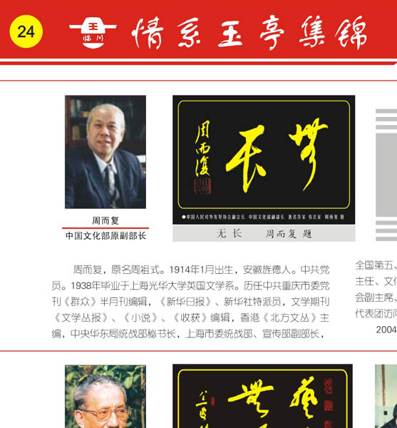 《凉亭外匾》周而复图片介绍:1.周而复 中国文化部原副部长 2.无长 (周而复题) 3.中国人民对外友好协会副会长、中国书法家协会副主席、著名作家周而复与书法爱好者合影。
