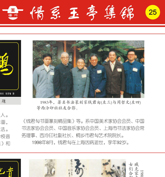 《凉亭外匾》钱君匋图片介绍:1.钱君匋 中国著名书画篆刻家 2.鹤寿 (钱君匋题) 3.1983年,著名书法篆刻家钱君匋(左三)与周哲文(左四)等西冷印社社友合影。