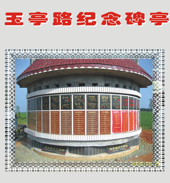 《玉亭路纪念碑亭》图片介绍:1.临川通往东乡的乡村玉亭公路 2.南丰县原公安局长、书法家黄鼎祺 3.玉亭路纪念碑亭朝南方向全景 4.墩上伢仔王吉安夫妇捐款献爱心
