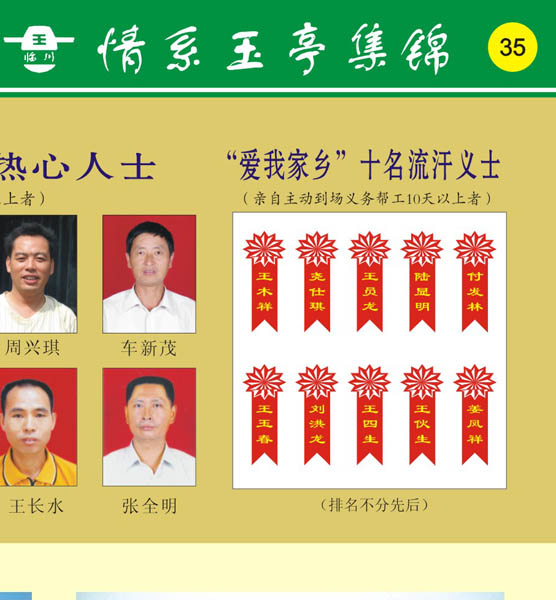 “爱我家乡”十名流汗义士(亲自主动到场义务帮工10天以上者):王木祥、尧仕琪、王员龙、陆显明、付发林、王玉春、刘洪龙、王四生、王伙生、姜凤祥(排名不分先后)