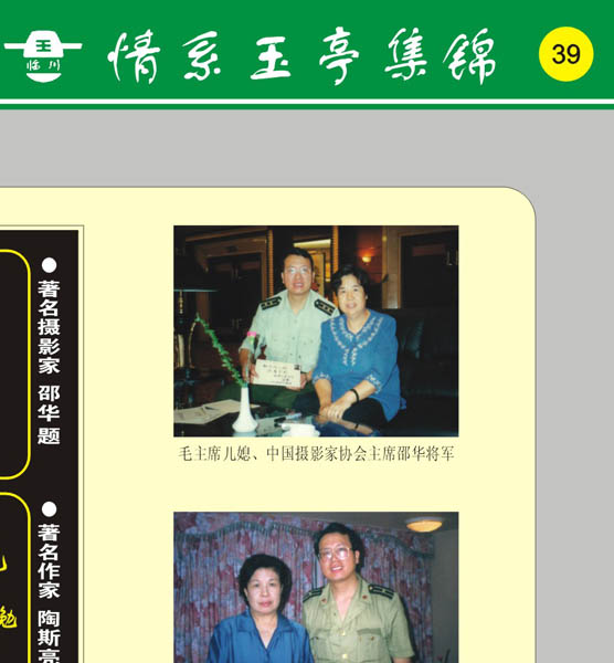图为:毛主席儿媳、中国摄影家协会主席邵华将军 2.著名作家陶斯亮题:心底无私天地宽 图为陶铸之女、中国市长协会会长陶斯亮 3.著名导演谢飞题:卷之而芷于密 放之而弥四海 图为:当代著名导演谢飞 4.著名香港歌星张学友题:祝福 图为:香港“四大天王”之一、著名歌星张学友
