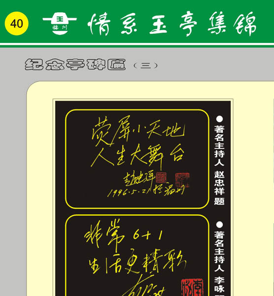 《纪念亭碑匾》(三)图片介绍:1.著名主持人赵忠祥题:荧屏小天地 人生大舞台 图为:中央电视台著名主持人赵忠祥 2.著名主持人李咏题:非常6+1生活更精彩 图为:中央电视台著名主持人李咏 3.著名相声演员马季题:乐此不疲 图为:著名相声演员马季 4.著名笑星陈佩斯题:以人快乐 自己快乐 图为:著名笑星陈佩斯