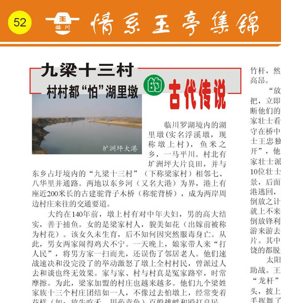 《可爱的家乡》九梁十三村 村村都“怕”湖里墩的古代传说:临川罗湖境内的湖里墩(实名浮溪墩,现称墩上村),鱼米之乡,一马平川。村北有圹洲坪大片良田,并与东乡占圩境内的“九梁十三村”(下称梁家村)相邻七、八华里并通路。两地以东乡河(又名大港)为界,港上有座近200米长的古建驼背子木桥(称驼背桥),成为两岸周边村庄来往的交通要道。