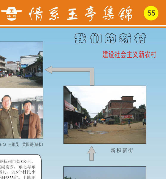 《可爱的家乡》我们的新村、建设社会主义新农村图片介绍:1.墩上凉亭(东方向)通往李家村、董塘老街、董塘新村、东乡马圩镇 2. 墩上凉亭(南方向)通往墩上新村、郑家村、临川太阳镇 3. 墩上凉亭(西方向)通往墩上老村、章家村、新积新街、罗湖老街、罗湖新街、罗湖镇人民政府、左起:吕法明(书记) 王银茂 黄国锐(镇长) 4. 墩上凉亭(北方向)通往墩上老村、圹洲坪