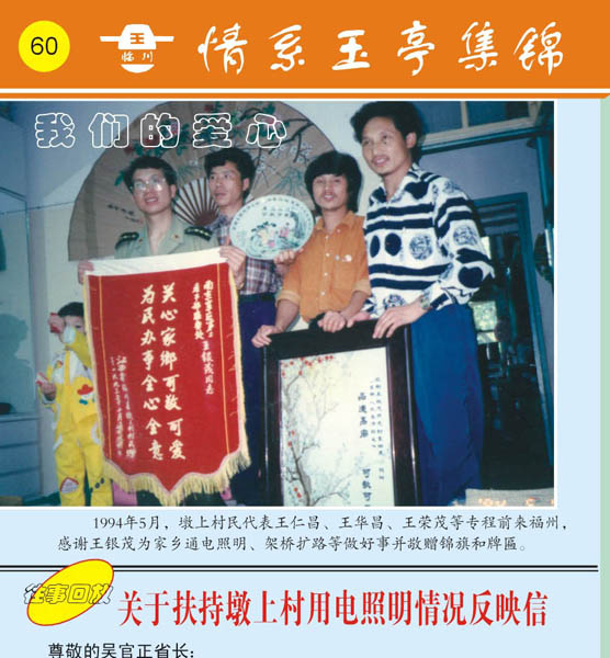 《可爱的家乡》我们的爱心图片介绍:1994年5月,墩上村民代表王仁昌、王华昌、王荣茂等专程前来福州,感谢王银茂为家乡通电照明、架桥扩路等做好事并敬赠锦旗和牌匾。