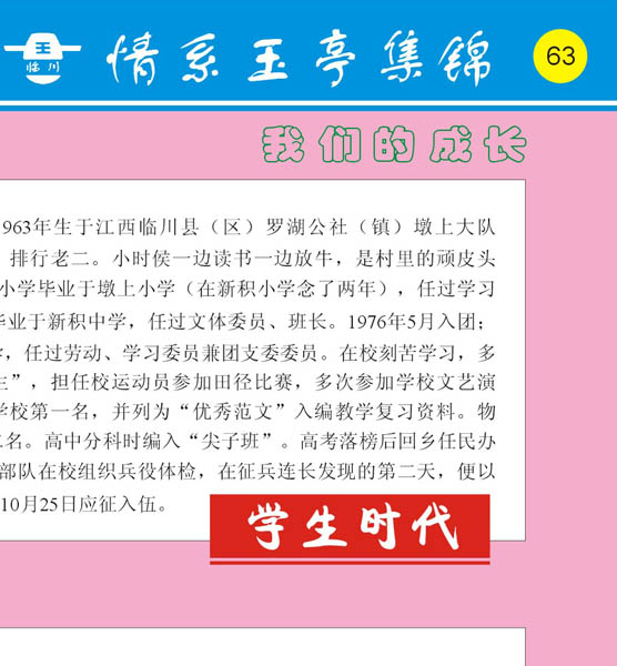 《难忘的时刻》我们的成长,学生时代:王银茂,男,1963年生于江西临川县(区)罗湖公社(镇)墩上大队(村)。贫农出身,排行老二。小时侯一边读书一边放牛,是村里的顽皮头子。6岁开始上学,小学毕业于墩上小学(在新积小学念了两年),任过学习委员、班长;初中毕业于新积中学,任过文体委员、班长。1976年5月入团;高中毕业于唱凯中学,任过劳动、学习委员兼团支委委员。在校刻苦学习,多次被评为“三好学生”,担任校运动员参加田径比赛,多次参加学校文艺演出。作文比赛曾获学校第一名,并列为“优秀范文”入编教学复习资料。物理、化学竞考获第二名。高中分科时编入“尖子班”。高考落榜后回乡任民办教师并担任语文教研组组长。1980年9月正巧部队在校组织兵役体检,在征兵连长发现的第二天,便以文书身份随接兵首长到各乡村进行兵员走访,10月25日应征入伍。