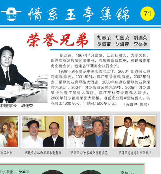 荣誉兄弟:胡连荣,1967年4月出生,江西抚州人,大专文化,现任荣誉酒店集团董事长,石狮市政协常委,福建省青年商会副会长,福建省江西商会执行会长。