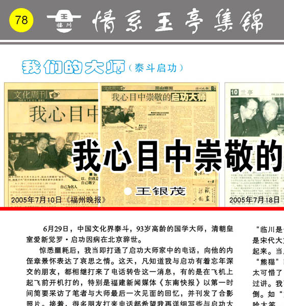 我心目中崇敬的启功大师(2005年7月10日《福州晚报》 2005年7月18日《书法报》 2005年7月23日《临川晚报》:6月29日,中国文化界泰斗,93岁高龄的国学大师,清朝室爱新觉罗·启功因病在北京辞世。