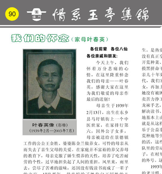 母亲生于1939年2月13日,出生在东乡县马圩镇街上一个中医世家,在家排行第六,因外公子女多,母亲被送给在景德镇工作的公公王金胜、婆婆陈金兰做养女。可怜的母亲从而失去了亲生父母的关爱。在家庭并不富裕的养父养母的教育下,母亲克服了娇生惯养的天性,培养了吃苦耐劳的个性,过早地担负起了人间的重担。风里来,雨里去,尝尽了苦难的滋味,还因没有钱读书而成了一辈子的文盲。17岁那年,母亲嫁给了她伯父王国胜的儿子——王才生,也就是我们的父亲。48年来,母亲与父亲风雨同舟,同甘共苦,生育、哺育、养育了我六个兄弟姐妹,还有一个女儿夭折,后来,她还抱养了一个景德镇的女孩叫徐素萍,母亲为我们流尽了最后一滴汗、用尽了最后一点力气,无私奉献了她老人家自己所有的一切,今天终于像一头辛劳了一辈子的老黄牛那样倒了下来。