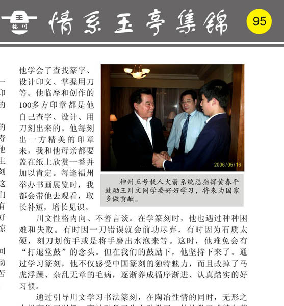 《永恒的纪念》我们的爱好(王川文学篆刻)图片介绍:1.神州五号载人火箭系统总指挥黄春平鼓励王川文同学要好好学习,将来为国家多做贡献。 2.《福建科技报》、《海峡教育报》、《文化生活报》、《小学生周刊》、《海峡教育报》、《福州晚报》 3.航天英雄在王川文印稿下签名