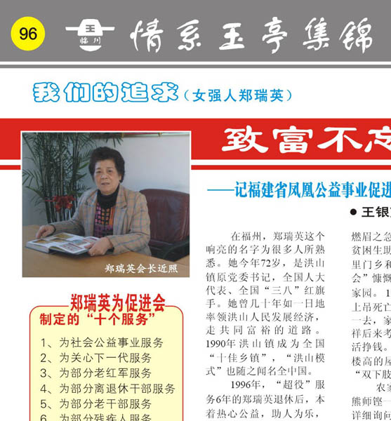 致富不忘奉献社会——记福建省凤凰公益事业促进会会长、福州市洪山镇原党委书记郑瑞英:在福州,郑瑞英这个响亮的名字为很多人所熟悉。她今年72岁,是洪山镇原党委书记,全国人大代表、全国“三八”红旗手。她曾几十年如一日地率领洪山人民发展经济,走共同富裕的道路。1990年洪山镇成为全国“十佳乡镇”,“洪山模式”也随之闻名全中国。