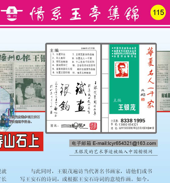 《珍贵的收藏》福建寿山石欣赏(二)图片介绍:1. 2005年8月28日《抚州日报》 2.图为王银茂应邀参观王安石纪念馆并为该馆题字留念。 3.QQ:1445798116 电子邮箱:1445798116@qq.com 网址(实名制):www.wangyinmao.com