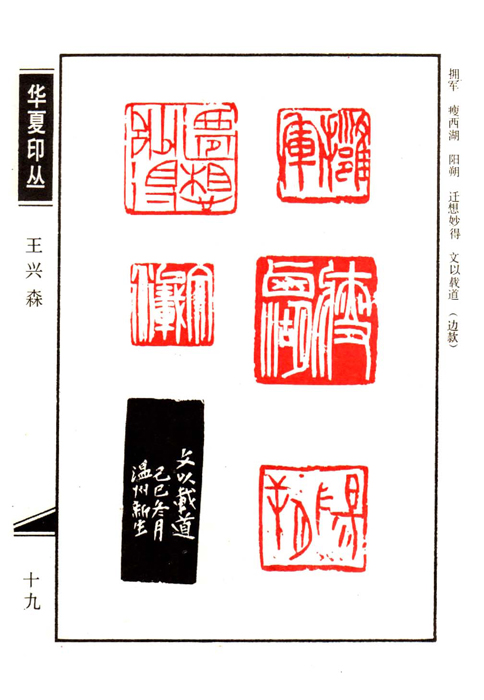 《华夏印丛》第19页 篆刻作者:王兴森(王兴森,笔名新生,1943年生。华夏印友会常务理事,温州市书法家协会会员。1962年读中专是自学篆刻。1963年参军辍学。1979年转业后旧好复萌,坚持至今。已在《书法》、《求是》、《中国文化报》等二百余家报刊发表过一千多方印作,多次在全国大展赛中获奖。
