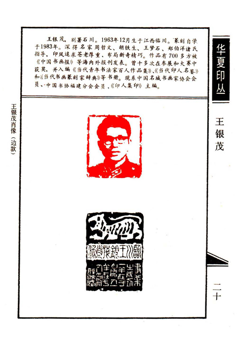 《华夏印丛》第20页 篆刻作者:王银茂(王银茂,别署石川。1963年12月生于江西临川。篆刻自学于1983年。深得名家周哲文、胡铁生、王梦石、陈石、郑伯洋诸位指导,印风追求苍老厚重,布局新奇精巧。作品有 700多方被《中国书画报》等海内外报刊发表。曾十多次在参展和大赛中获奖,并编入《当代青年书法家百人作品集》、《当代印人明鉴》和《当代书画篆刻家辞典》等书册。现系中国名城书画家协会会员,中国书法家协会江西分会会员,《印人集印》主编。)