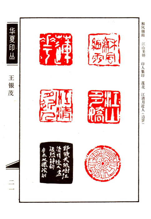 《华夏印丛》第21页 篆刻作者:王银茂(王银茂,别署石川。1963年12月生于江西临川。篆刻自学于1983年。深得名家周哲文、胡铁生、王梦石、陈石、郑伯洋诸位指导,印风追求苍老厚重,布局新奇精巧。作品有 700多方被《中国书画报》等海内外报刊发表。曾十多次在参展和大赛中获奖,并编入《当代青年书法家百人作品集》、《当代印人明鉴》和《当代书画篆刻家辞典》等书册。现系中国名城书画家协会会员,中国书法家协会江西分会会员,《印人集印》主编。)