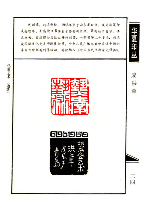 《华夏印丛》第24页 篆刻作者:成洪章(成洪章,别名奇松1943年生于山东龙口市。现为华夏印友会理事、青岛沧口书法美术协会副主席。篆刻始于自学,博采众长。曾获得全国大赛性特等奖。中央人民广播电台曾采访专题向海内外接受其创作活动,并被编入《中国当代书画家大辞典》。)