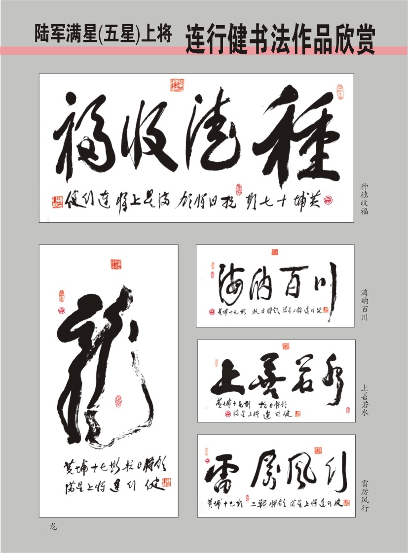 连老将军戎马一生,现虽已是九十余高寿,但身体硬朗,思维敏捷,博学多才,风趣幽默,尤其是他那经过近百年乳润的书法作品,更是以流美飞动、刚健圆劲的线条,奇险参差的结构、疾风骤雨的取势征服“翰墨众生”。连将军的书法是用心抒发了一个军人的豪迈和抱负,融驰骋快意和嘹亮大气与笔端,深受广大书法爱好者喜爱,在巴黎书画拍卖会上,连将军的一幅六尺墨宝竟拍到三十万元人民币。目前在大陆,有很多企业商人,政界和收藏界人士,以每幅(四尺)五千元进行收藏。