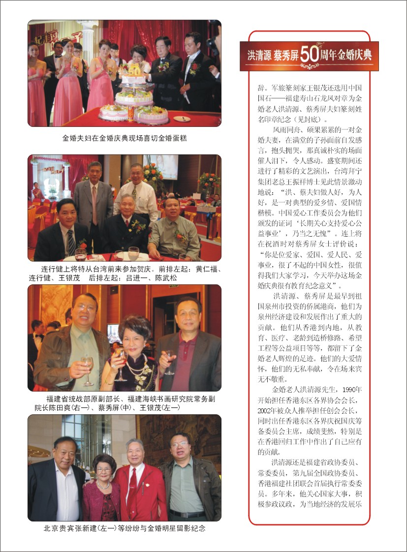 2011年11月20日,洪清源、蔡秀屏50周年金婚庆典在泉州迎宾馆丰泽厅举行。喜宴布置新颖,别具一格,场内以“一起走过的日子”为主线背景,厅内厅外,金碧辉煌;台上台下,喜气洋洋。有散发清香的鲜花,有身着盛装的美女,有热情好客的员工,有全国各地的精英。